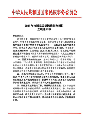 近日,国家民委科研项目管理办公室下发了2025年度国家民委民族研究项目立项通知书,我院罗衍军教授申报的《抗日战争时期中国共产党的中华民族观研究——以抗战报纸文本叙事为中心》获批立项。