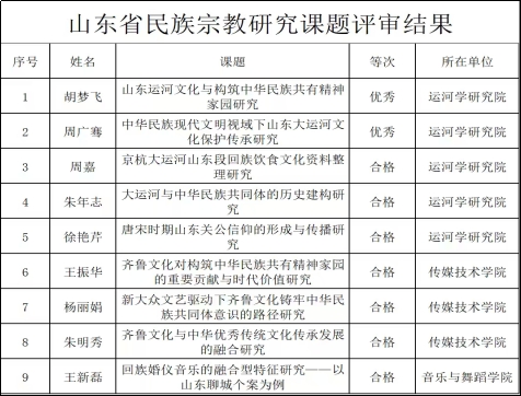 近日,山东省民族宗教事务委员会公布了2025年度全省民族宗教重点课题评审结果,研究院周广骞、朱年志、周嘉、胡梦飞、徐艳芹五位老师主持的课题顺利通过结项验收。此次结项课题紧扣“铸牢中华民族共同体意识”核心主题,研究领域涵盖山东运河文化传承、齐鲁文明交融、民族民俗演变、民间信仰发展等方向,充分展现了研究院在民族宗教研究领域的深厚学术积淀与前沿探索能力。
